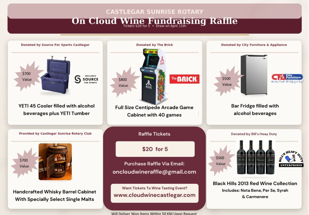 Pre-book your hotel room at the Castlegar Sandman Hotel at discounted prices — brought to you by the Castlegar Sunrise Rotary Club in partnership with the Castlegar Sandman Hotel.